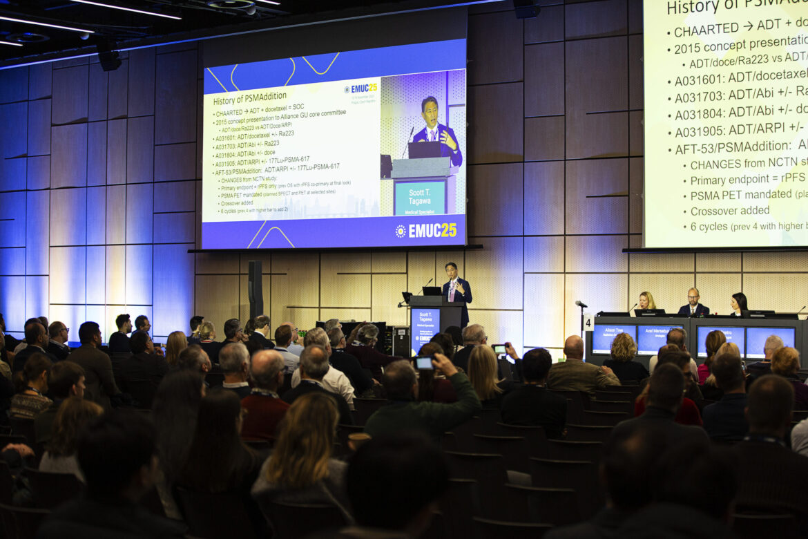 In an auditorium packed to capacity, Dr. Elena Castro (ES), Prof. Axel Merseburger (DE), and Dr. Alison Tree (GB), chaired the ‘Game-changing’ session on day three of EMUC25, which offered a concise wrap-up of an exceptional year in oncology research, particularly for prostate cancer patients. This report summarises the presentations on PSMAddition, AMPLITUDE, CAPItello-281, and EMBARK results.